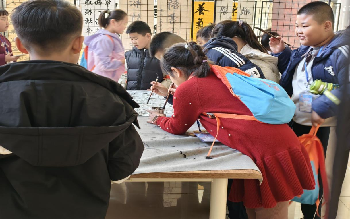 活动期间,志愿者带领小记者们开启沉浸式校园探索之旅。首站来到板式网球场,讲解球场玻璃防风护场、优化运动环境的功能,让小记者们直观感受校园运动空间的匠心设计。随后移步操场,介绍塑胶跑道减震防滑的环保材质特性,在实践观察中传递校园设施的科技与人文关怀。行至泽虬河畔,志愿者阐释“泽虬”二字“泽润万物,虬龙昂扬”的文化内涵,让小记者们在潺潺流水间体悟校名承载的精神底蕴。图书馆内,书画展的墨韵丹青、自行车发电的科技趣味、毛笔字体验的文化传承,在志愿者的讲解中层层铺展,为小记者们打造出知识与艺术交融的文化天地。最后,带领小记者们来到六餐厅,厅内的三角钢琴成为“意外之喜”,在温馨的用餐氛围中,为本次校园探索画上艺术句号。