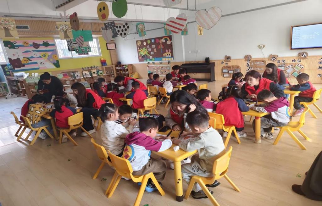 活动中,志愿者们带着画笔、颜料等绘画材料,与孩子们共同开启了一场色彩斑斓、想象无限的对话之旅。有的孩子下笔果决,寥寥数笔便勾勒出奔跑的小火车,还不忘用蓝色涂满天空,说要“让火车驶向云朵”;有的则细心搭配色彩,为小花涂上渐变的粉色,为小草晕染深浅不一的绿色,专注的神情宛若小小艺术家。一张张画纸上,承载着孩子们天马行空的创意与纯真美好的童心。活动尾声,孩子们纷纷举起自己的作品——绚丽的彩虹、可爱的动物、温馨的家庭、奇幻的太空……教室瞬间化作一片色彩的海洋,洋溢着创造与欢乐的氛围。
